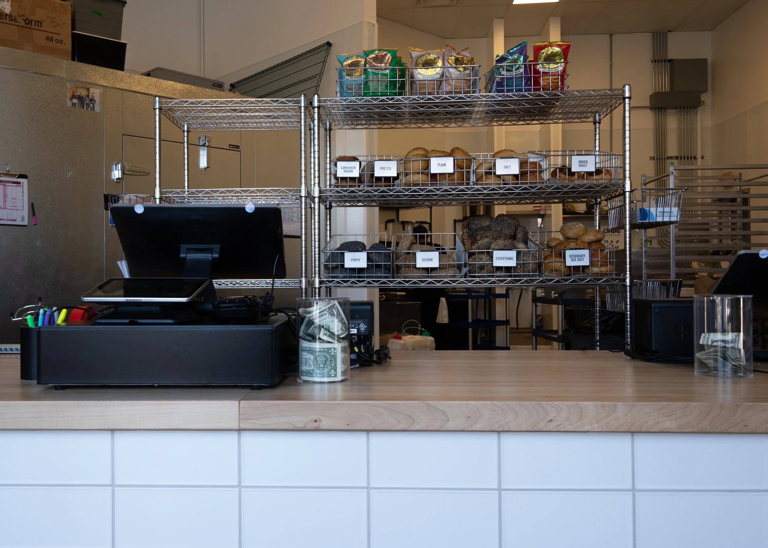 A breezy customer flow to the large service countertop and a bustling kitchen area just behind evokes the feel of a family-owned and operated bagel shop true to Hank’s expanding brand. Welcoming and friendly staff are immediately visible upon entrance.